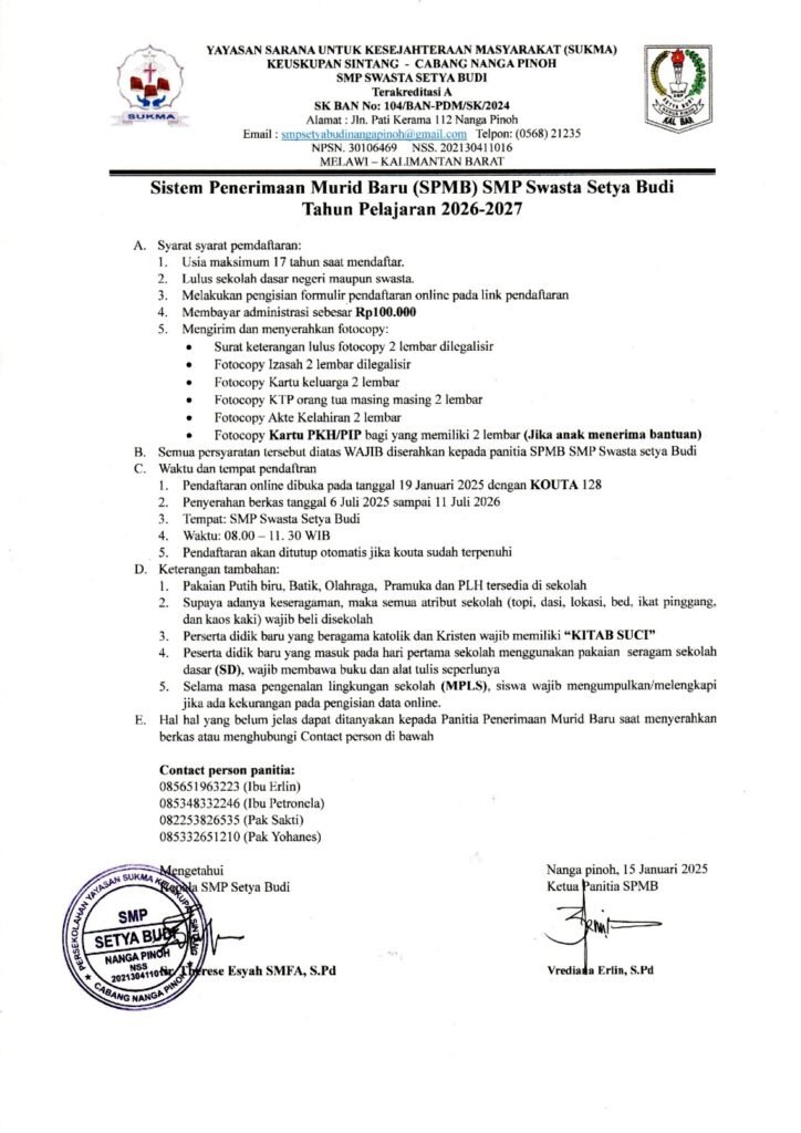 “Masa depan cerah lahir dari sekolah yang tepat. SMP Swasta Setya Budi, tempat karakter dibentuk dan prestasi ditumbuhkan.”